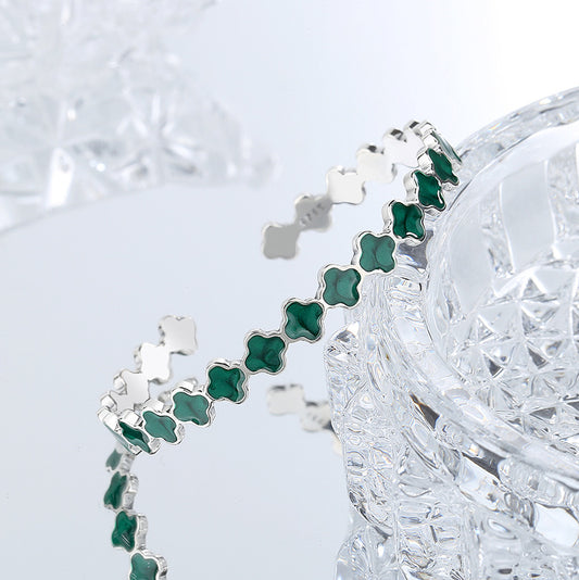 S925 Sterling Silver Four Leaf Flower Quicksand Enamel Female Adjustable Fashionable Drop Glaze Avocado Color Bracelet