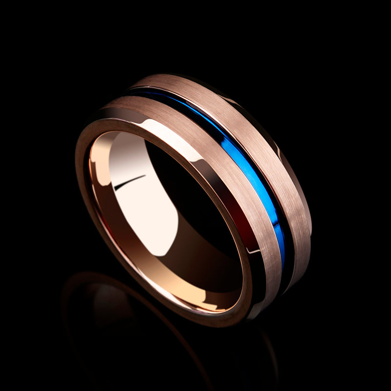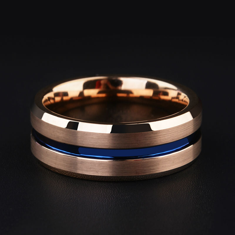 New Arrival 8MM Width Rose Gold Man Jewelry Rings Tungsten Carbide Band with Thin Blue Groove and Brushed Finishing