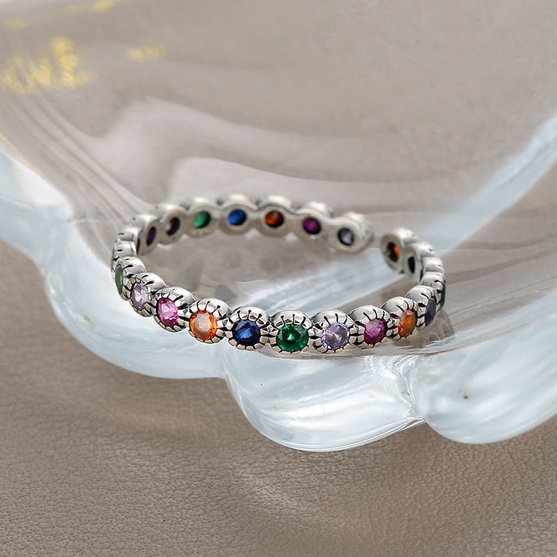 S925 Silver Colorful Zircon Ring Women's Retro Fashion Bright Color Contrast Flowers